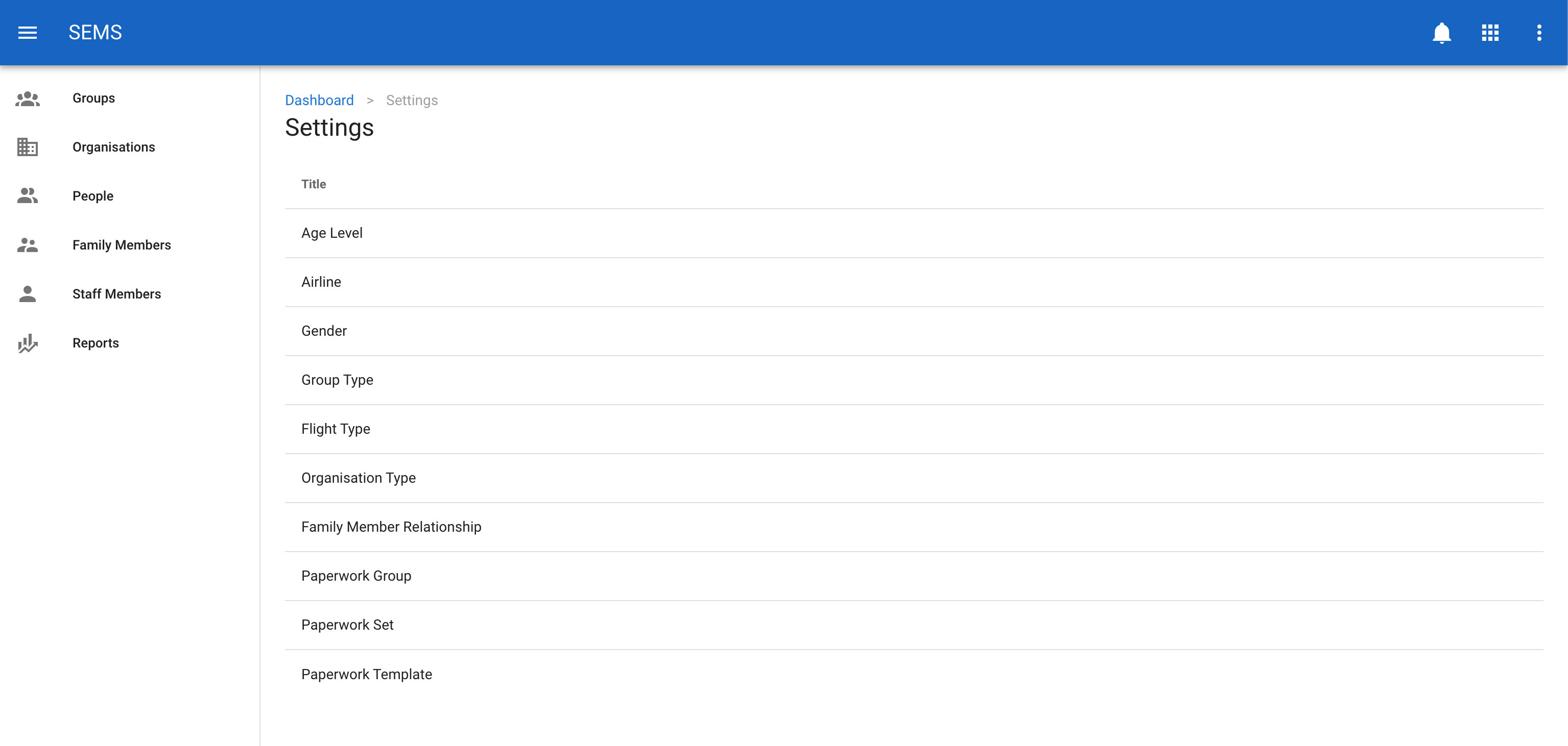 The settings page allows the AIIU SEMS administrator to add and edit various list items and or settings that are used throughout the application. Setting items include: