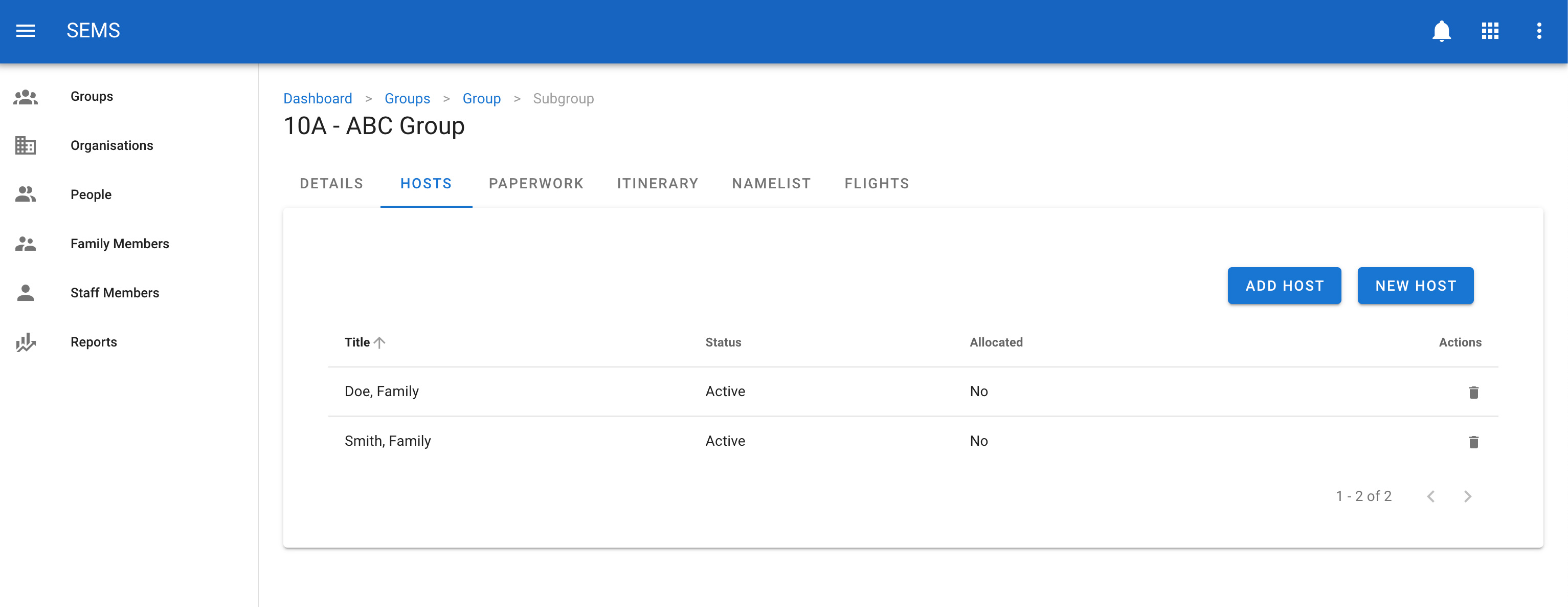 If a host family should no longer be in this sub group you can remove them by clicking on the trash icon next to the host family name. This will only remove them from this sub group and not the system.