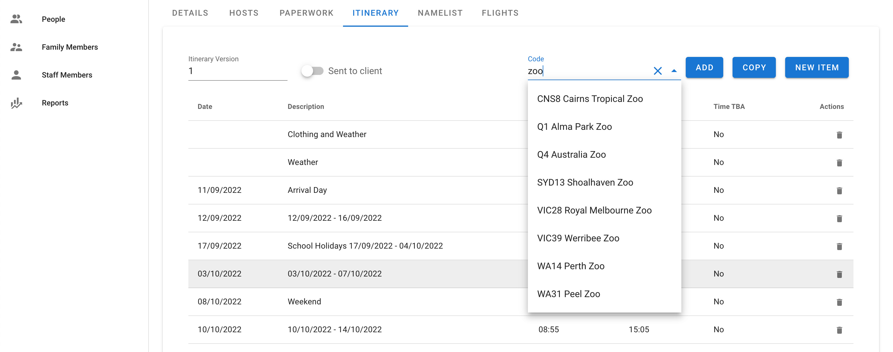 To add existing itinerary items from the itinerary library just enter the library code into the code box and select the item from the dropdown. Once you have selected the correct one click the add button.