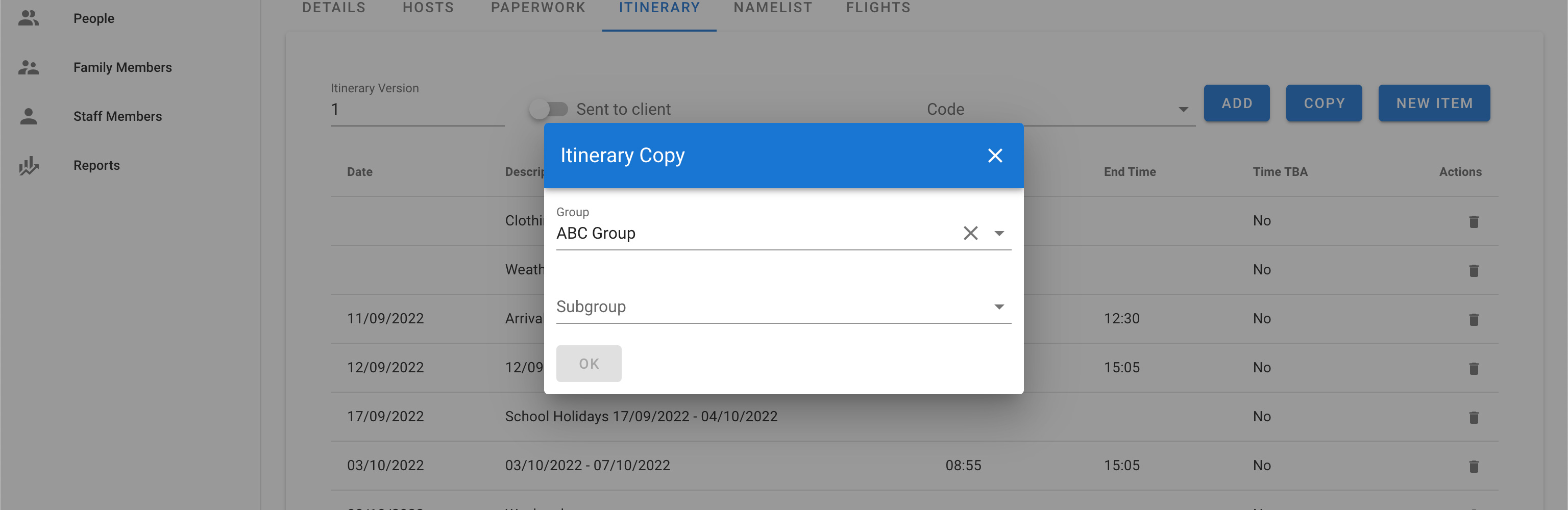 To copy all the itinerary items from another group click the Copy button, this will open the Itinerary Copy popup window. This will allow you to search groups and select another sub group to copy from. Once the sub group is selected press the OK button. This will copy all the items across to the current sub group.