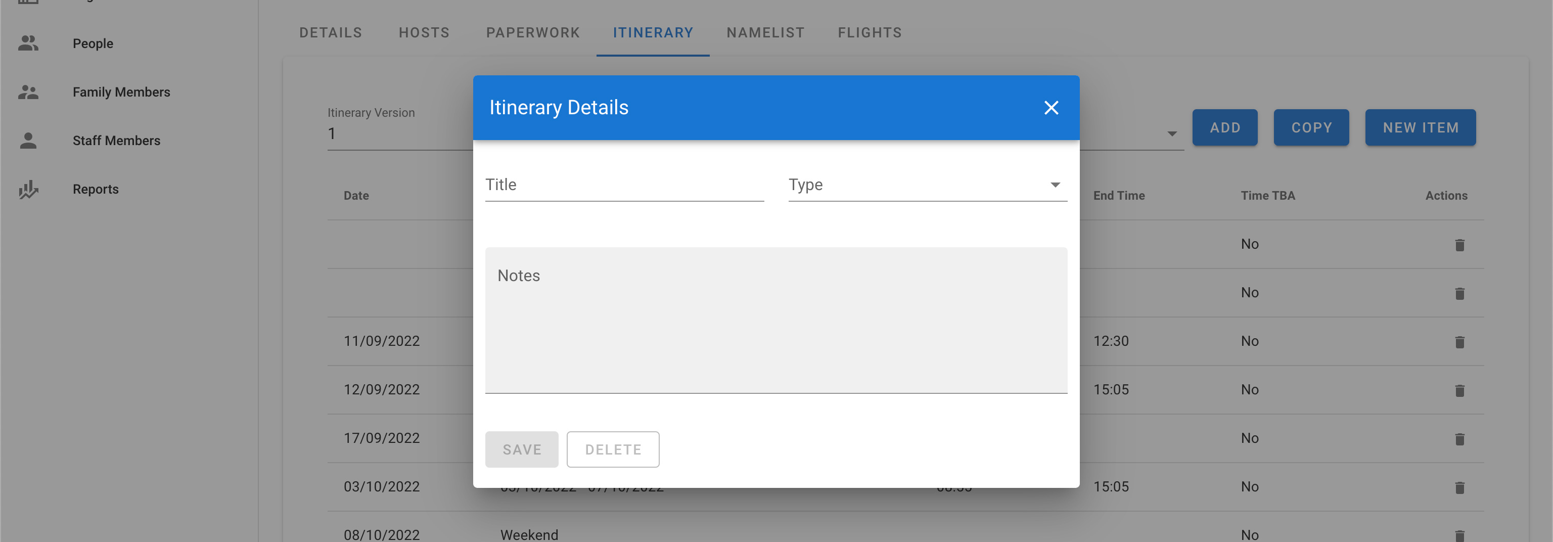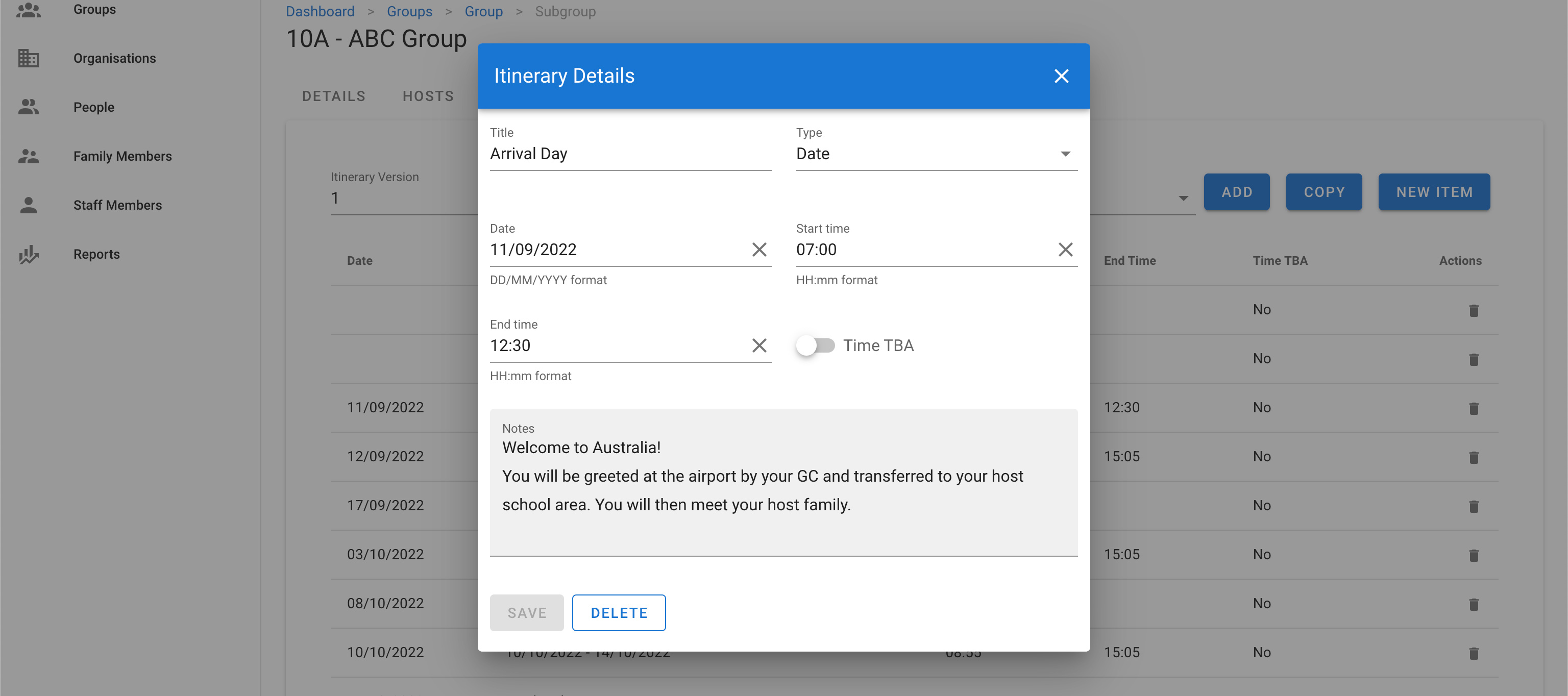 To change or edit an itinerary item, navigate to the sub group page, select the itinerary items tab and click on the title or row of the itinerary item you want to edit.