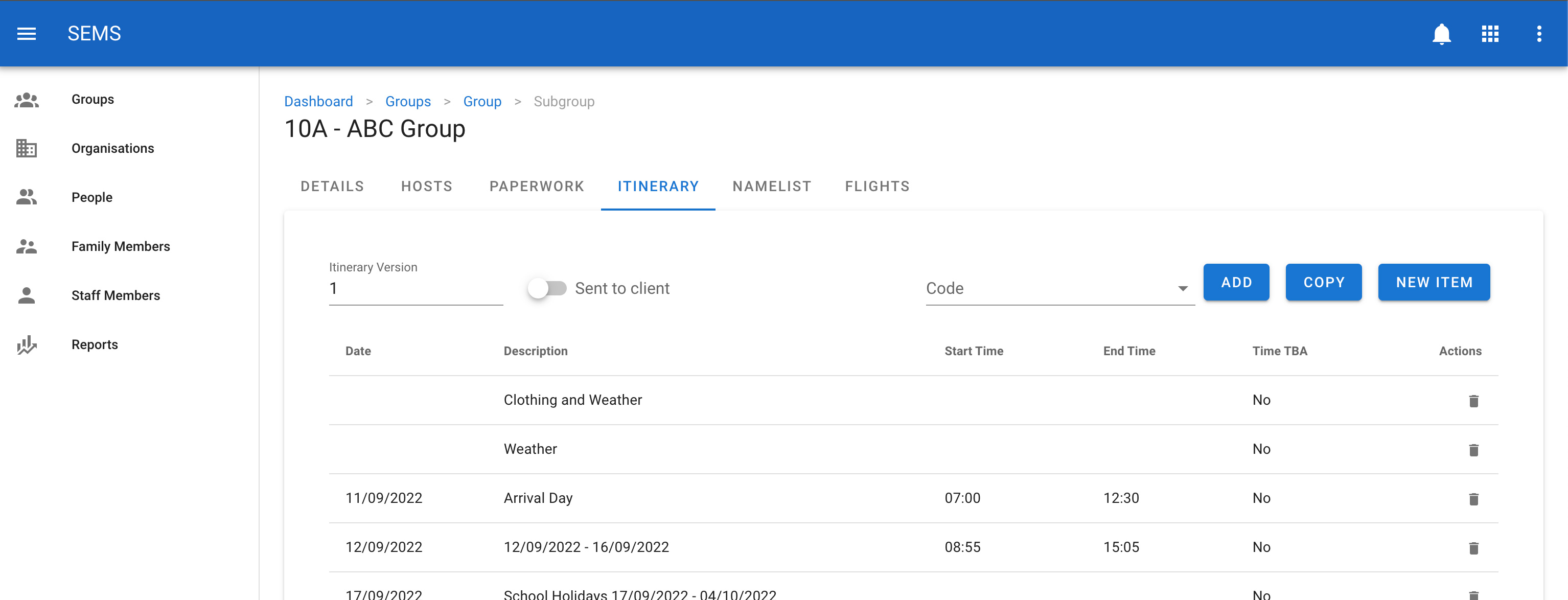 To delete an itinerary item navigate to the sub group page and select the itinerary items tab, then click the icon Delete which is shown as a trash icon on the list view for an itinerary item.