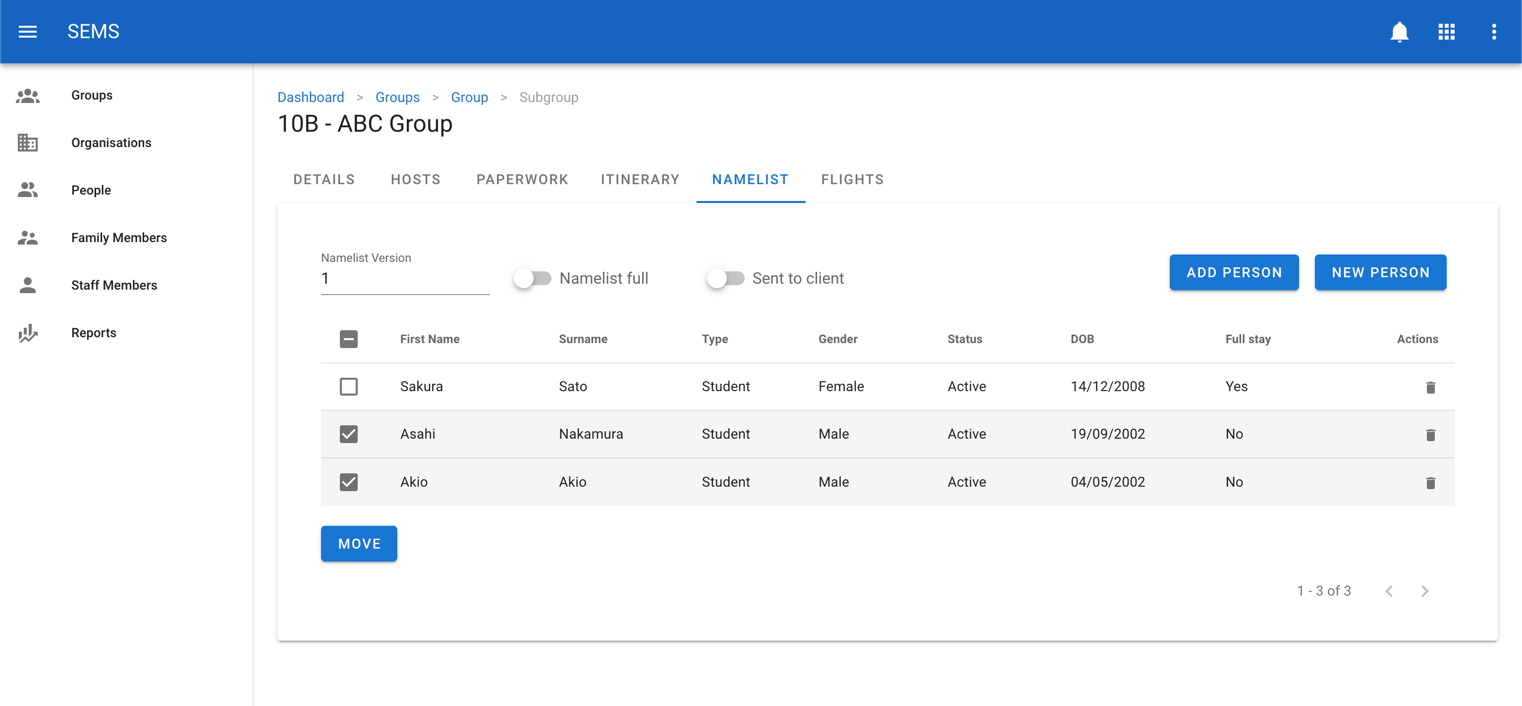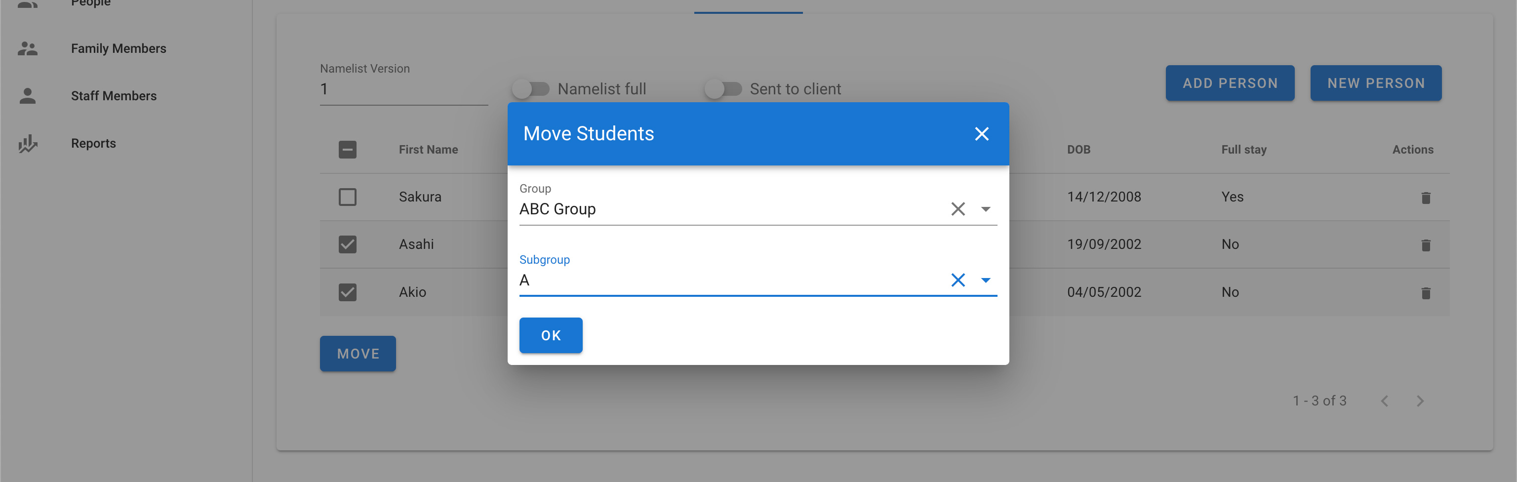 To assign a student to a new host family, make sure you have already added a host family to the sub group. Then select the student you want to assign in the namelist by clicking on their name.