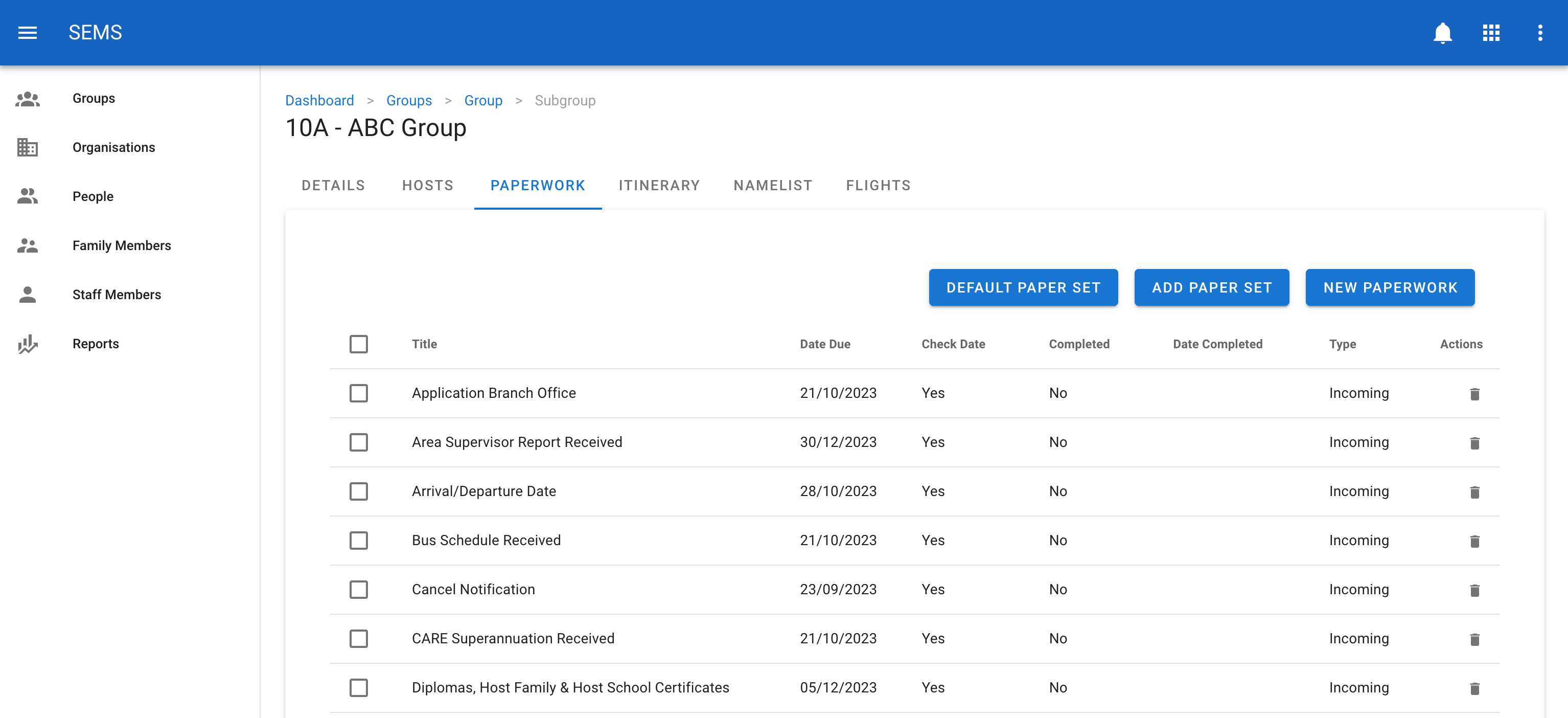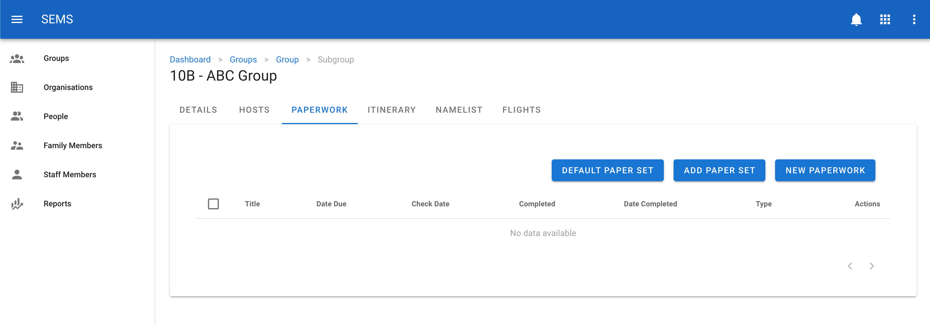 Select the paperwork tab in the sub group you are editing. To add the default paper set for the group click on the Default Paper Set button. This will generate a list of paperwork based on the main groups current paperwork setting.