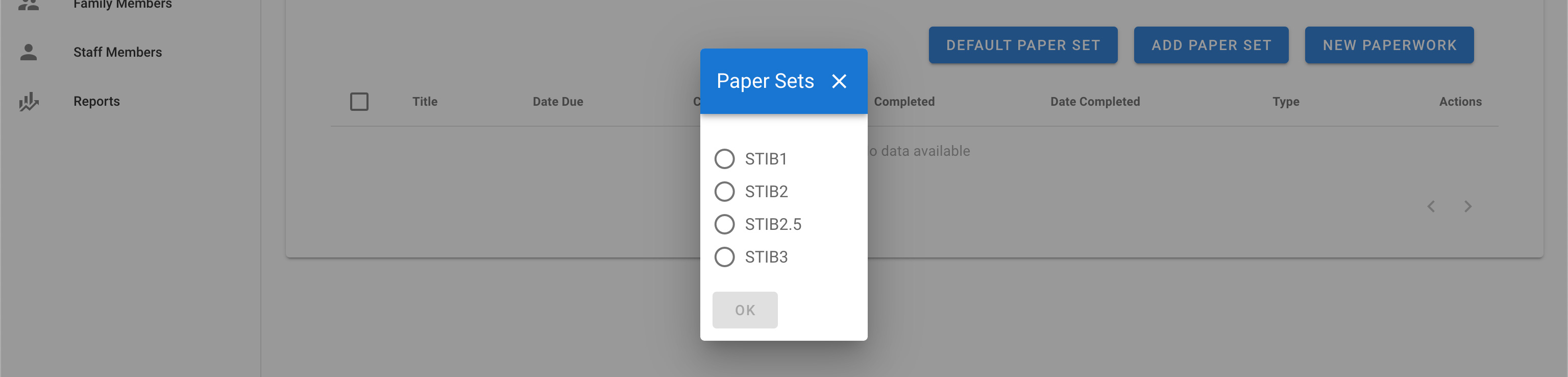 If you do not want to use the default paperwork set, you can choose to select the paperwork set from a list by clicking on the Add Paper Set button. Once you have selected the correct paper set click the OK button.