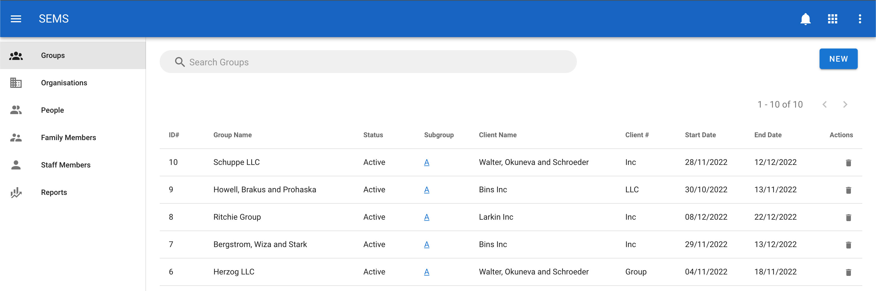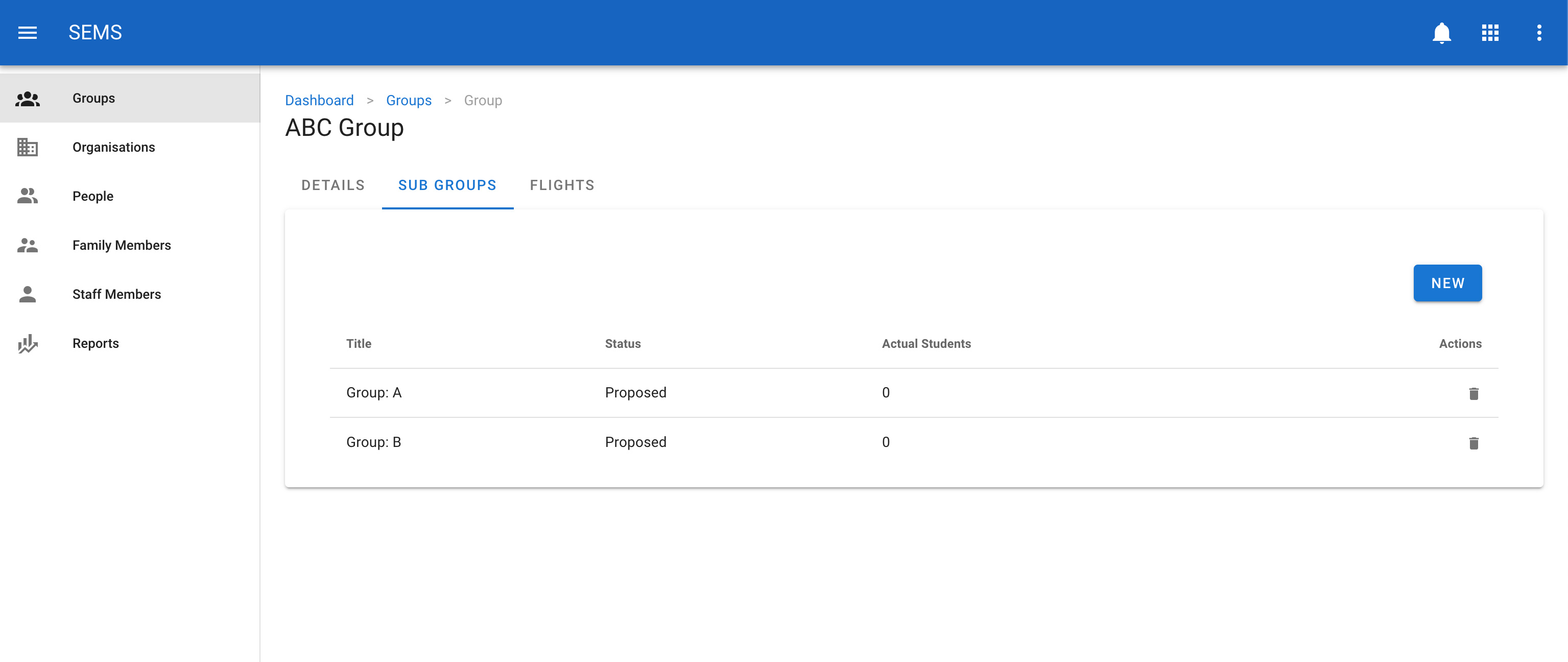To delete a sub group navigate to the Groups page and select the sub groups tab, then click the icon Delete which is shown as a trash icon on the list view for a sub group.