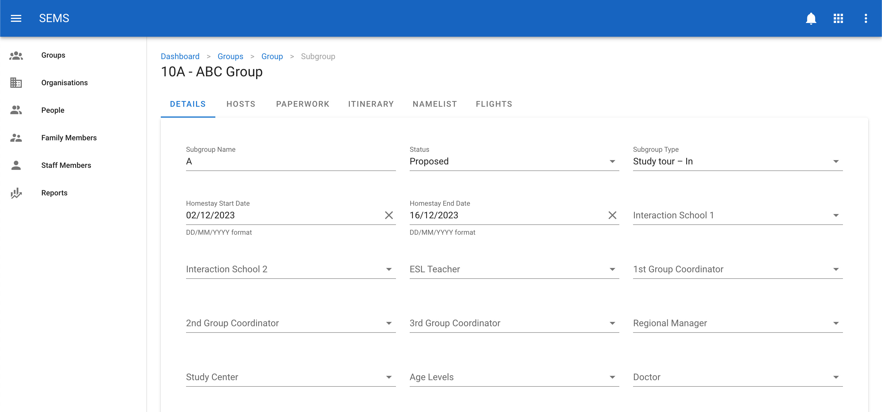 Once saved the sub group another set of tabs will appear. These tabs will enable you to manage: