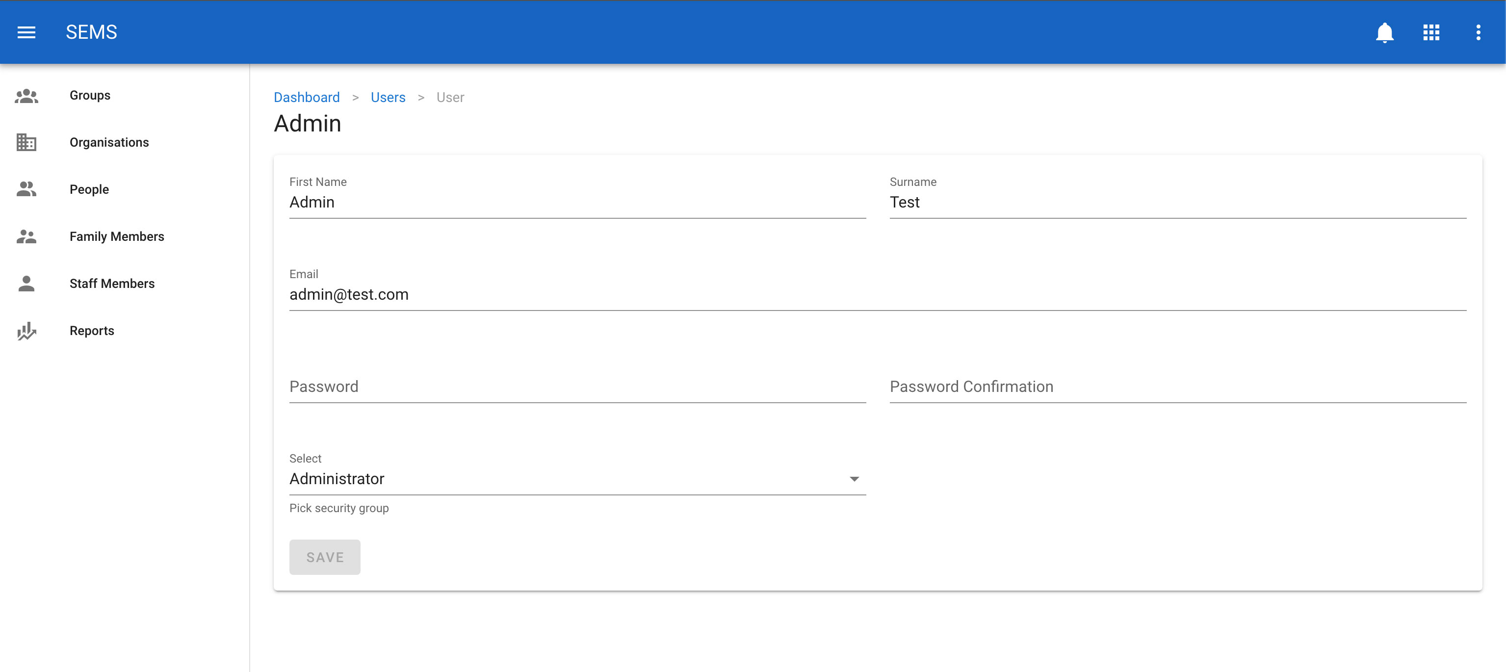 Once on the user edit screen, enter the new details in the fields provided. Then confirm the change by clicking the Save button.