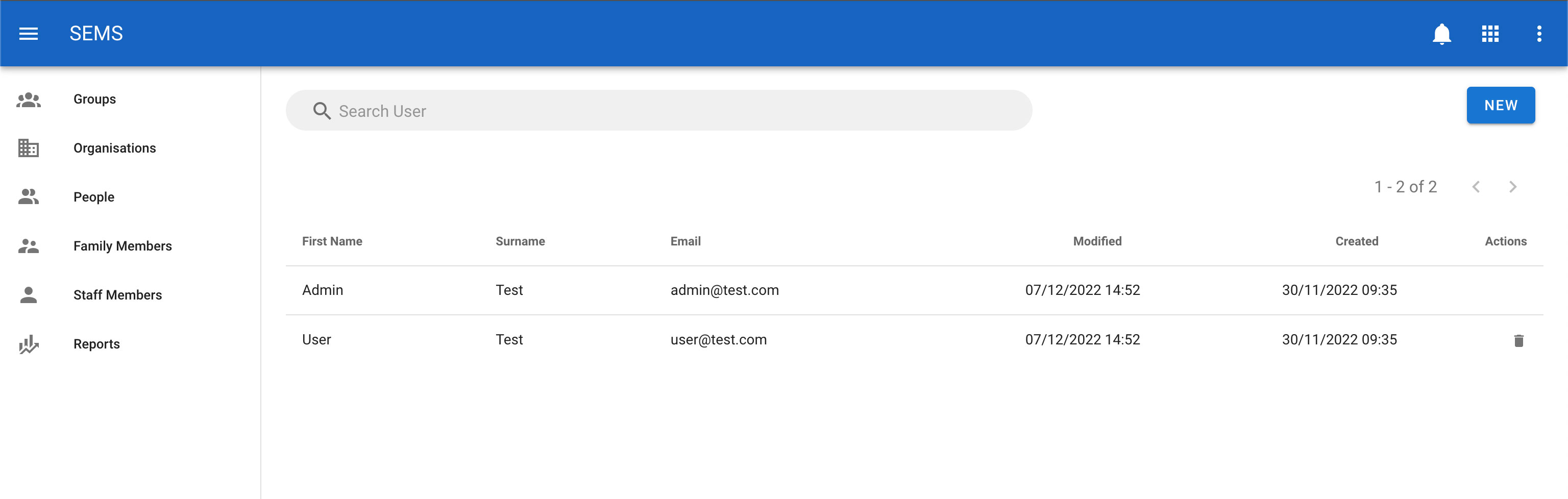 To delete a user, navigate to the Users page, click the icon Delete which is shown as a trash icon on the list view for a user.